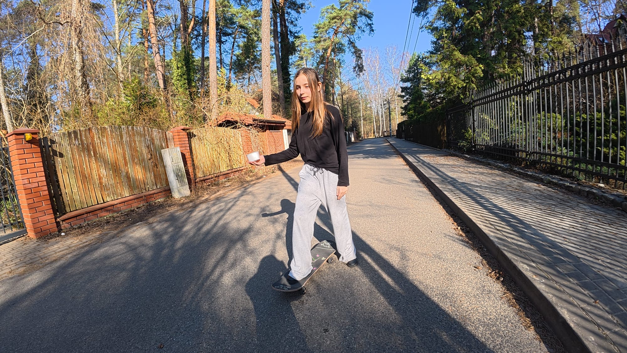 Today was Friday, which mens "treats day" - we were supposed to have cinnamon rolls. I asked Mom if I could go get the cinnamon rolls by myself. She said yes, but I had to take Ida with me. She went on her roller skates, and I went on my skateboard. The Patera bakery, where they sell cinnamon rolls, is in Podkowa Główna, and it’s already 3:00 p.m., so we have to hurry. These pastries are so good that you have to get there earlier in the morning to get them. At least that’s what Mom said. But you always have to have hope.