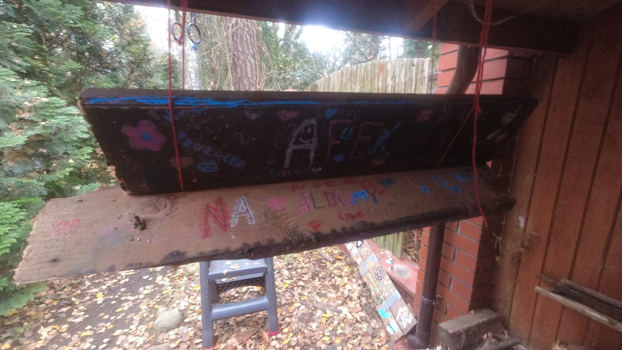 And we definitely needed a table for food. Last year, we had leaf-shaped bowls that Lila and Jula made themselves. But they also got wet because they were made of clay, and we, being stupid (as usual), took them outside the shelter and forgot to put them away. Of course, it rained heavily during the night and the beautiful bowls were ruined. Instead of a table, we decided to use a tree stump because it looks nicer. I wanted to check something else on the roof of the garbage bin,