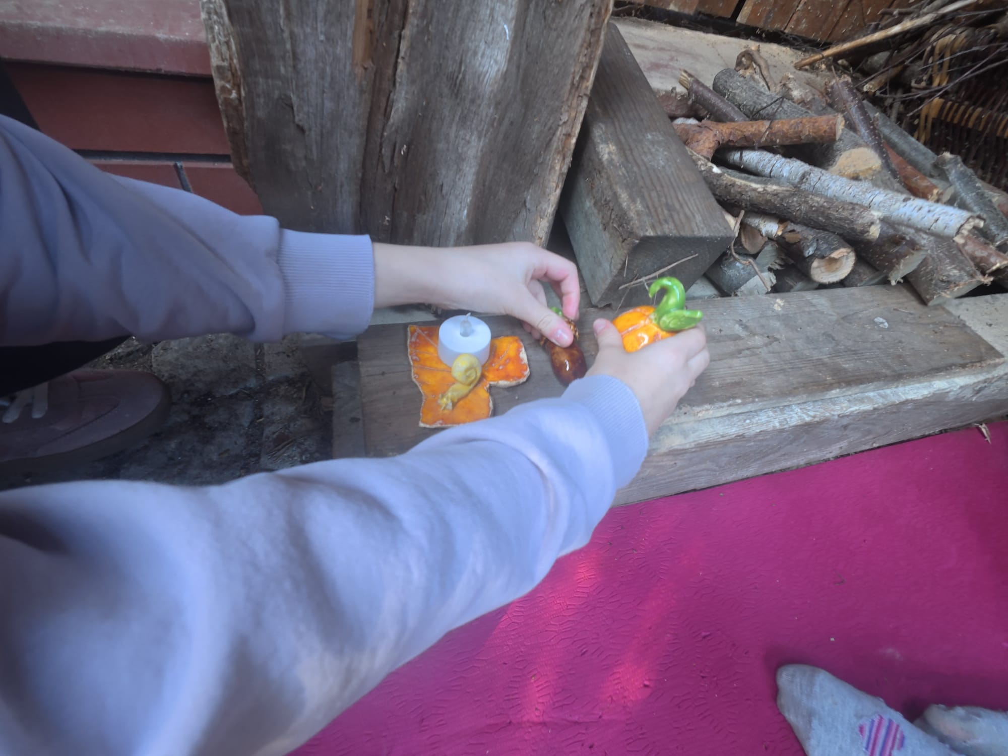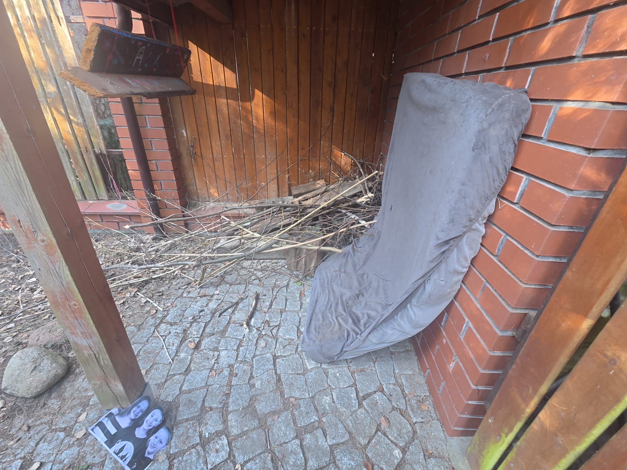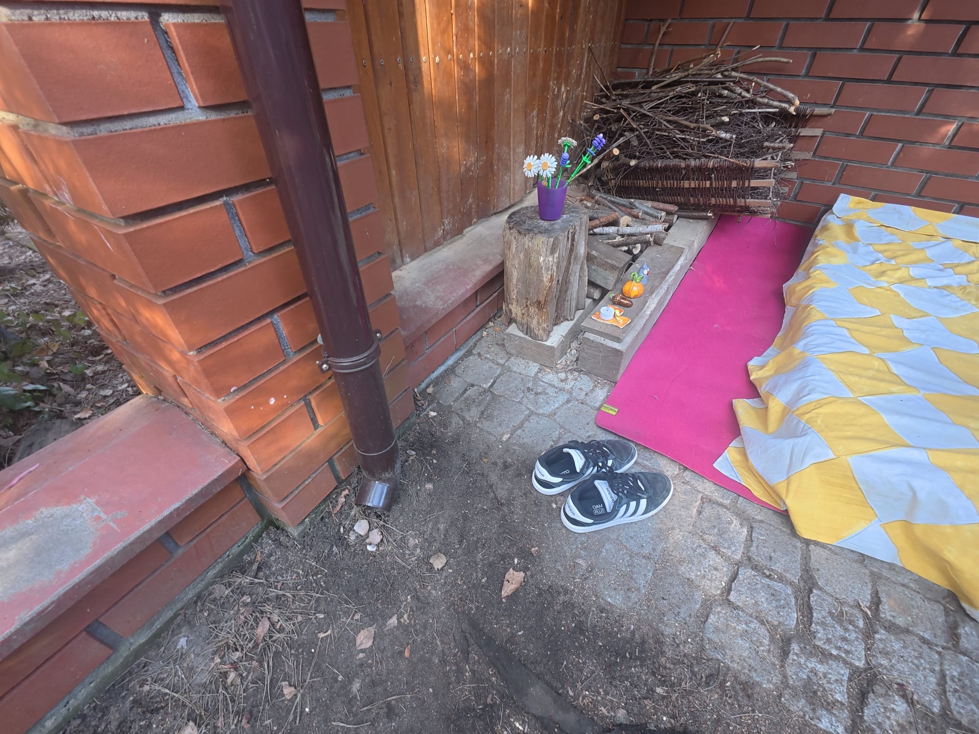 When we heard the door slam shut, we ran back to Lili and Julia's garden. We started renovating the base, cleaning up the cobwebs, and moving the mattress to where it had been in the summer. The mattress took up most of the space, but a smaller part of the bunker floor was still empty. Lila said that, first of all, it's too gray here, and secondly, if we don't sit on a mattress, our butts will get cold. Decorations were also needed. Fortunately, Lila and Jula have a box with various odds and ends. It contained their old ceramic items