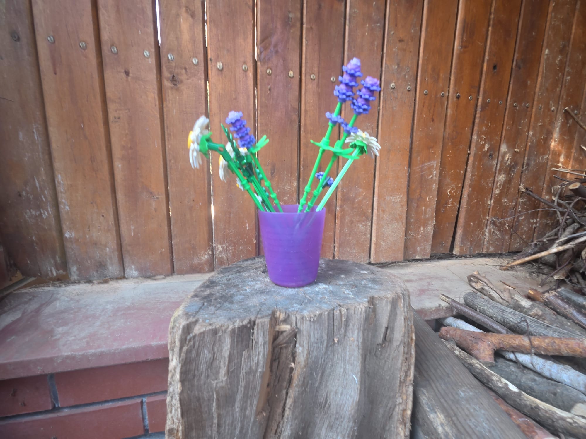 , an electric candle that was at the base a year ago, and Lego flowers.