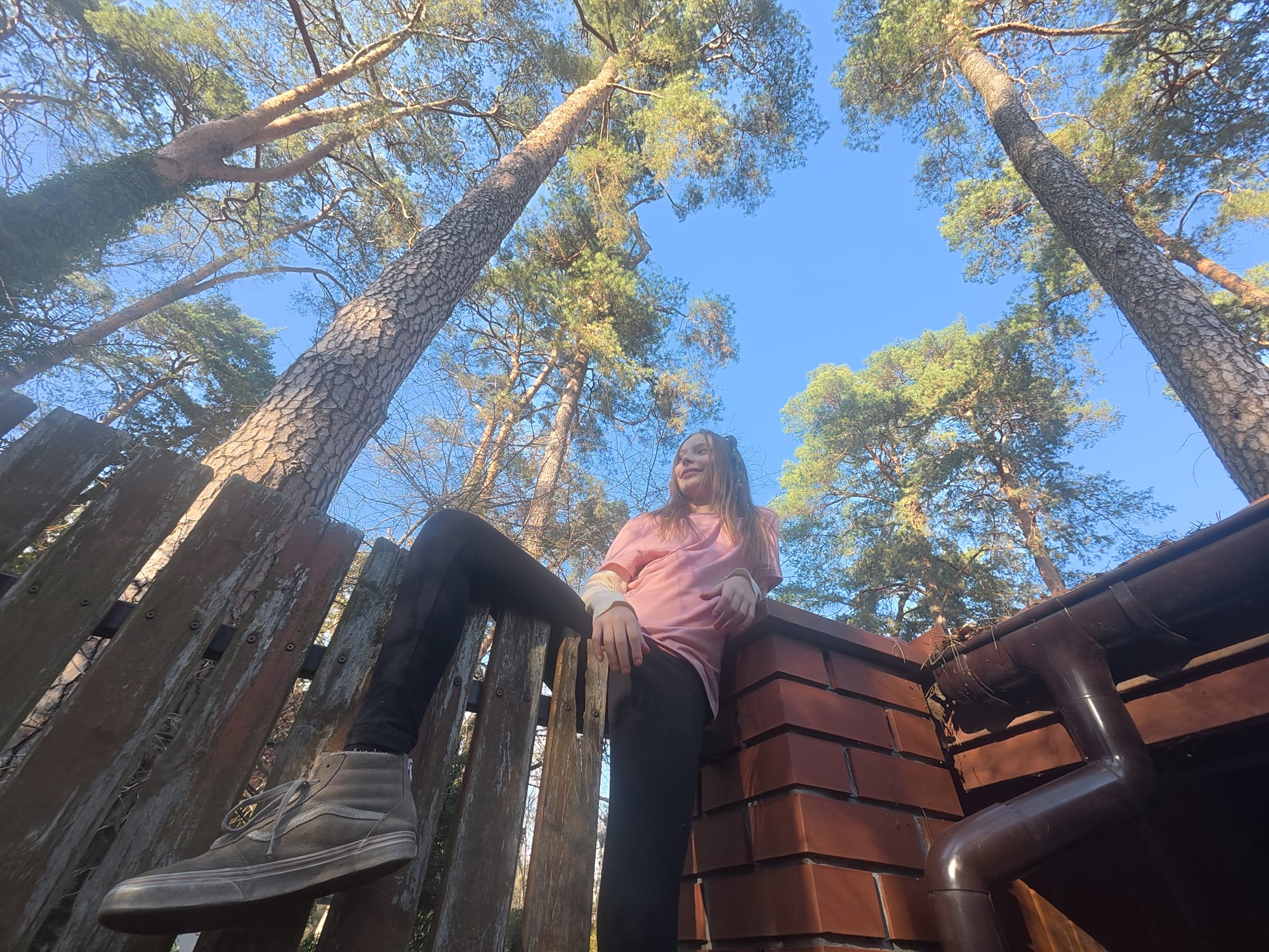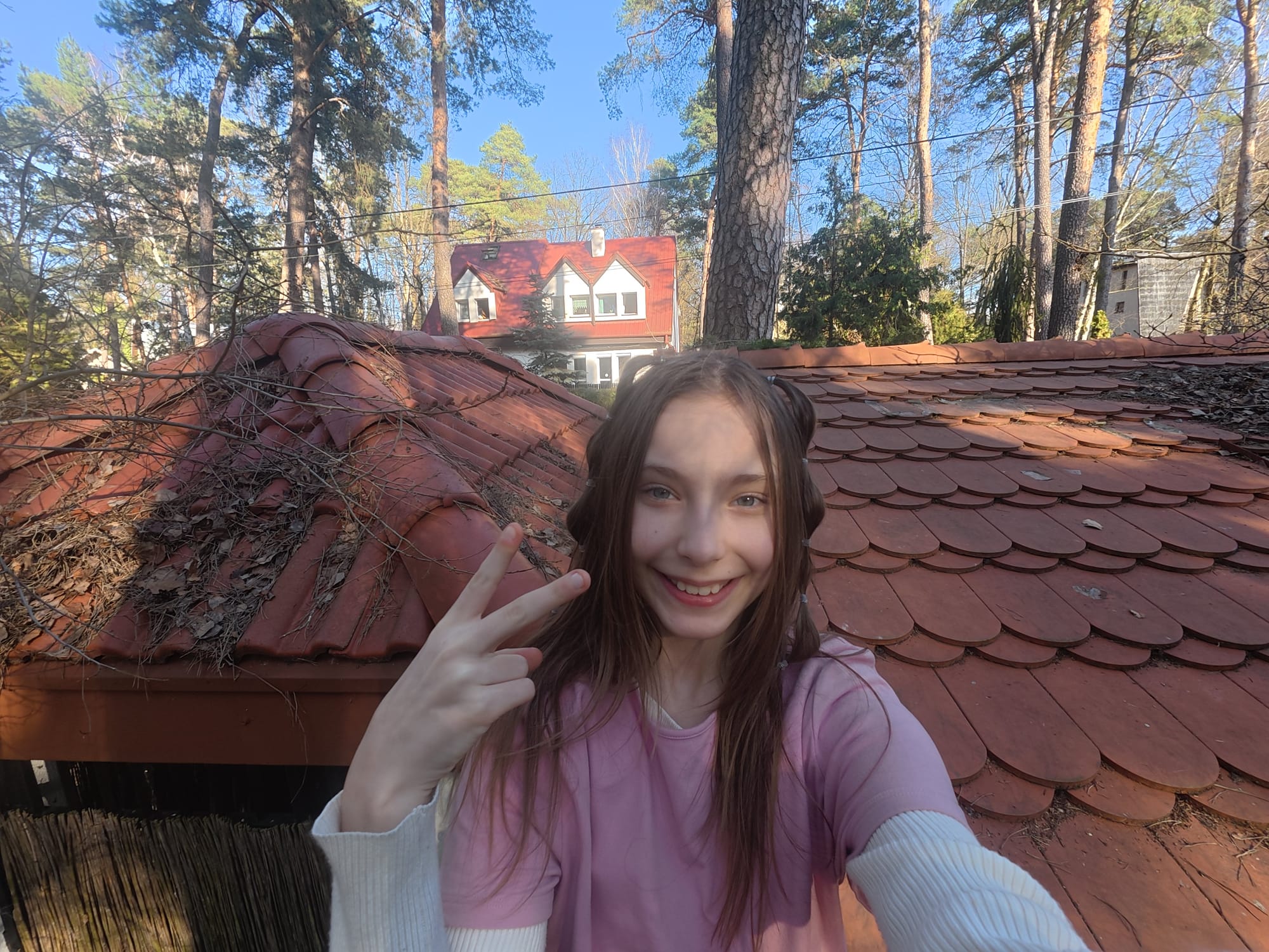 Last summer, we built a pretty solid bunker near Lila and Julia's garbage shed. There is a small roof above the shed, where we hung a mosquito net. That was the first part of the base. A few days later, I realized that you could climb onto the roof of the garbage shed through a hole in the fence. It just so happens that the roofs of our garbage sheds are next to each other. There is only a small hole between them that you have to jump over to get to my roof. Last summer, my side of the garbage shed roof was terribly overgrown with ivy. It took us a long time to remove this plant from the roof. And you know what? Now it's just as overgrown as it was a year ago! And the girls' roof is covered with pine needles. So we get to work. First, we sweep the needles off Lila and Julia's roof.