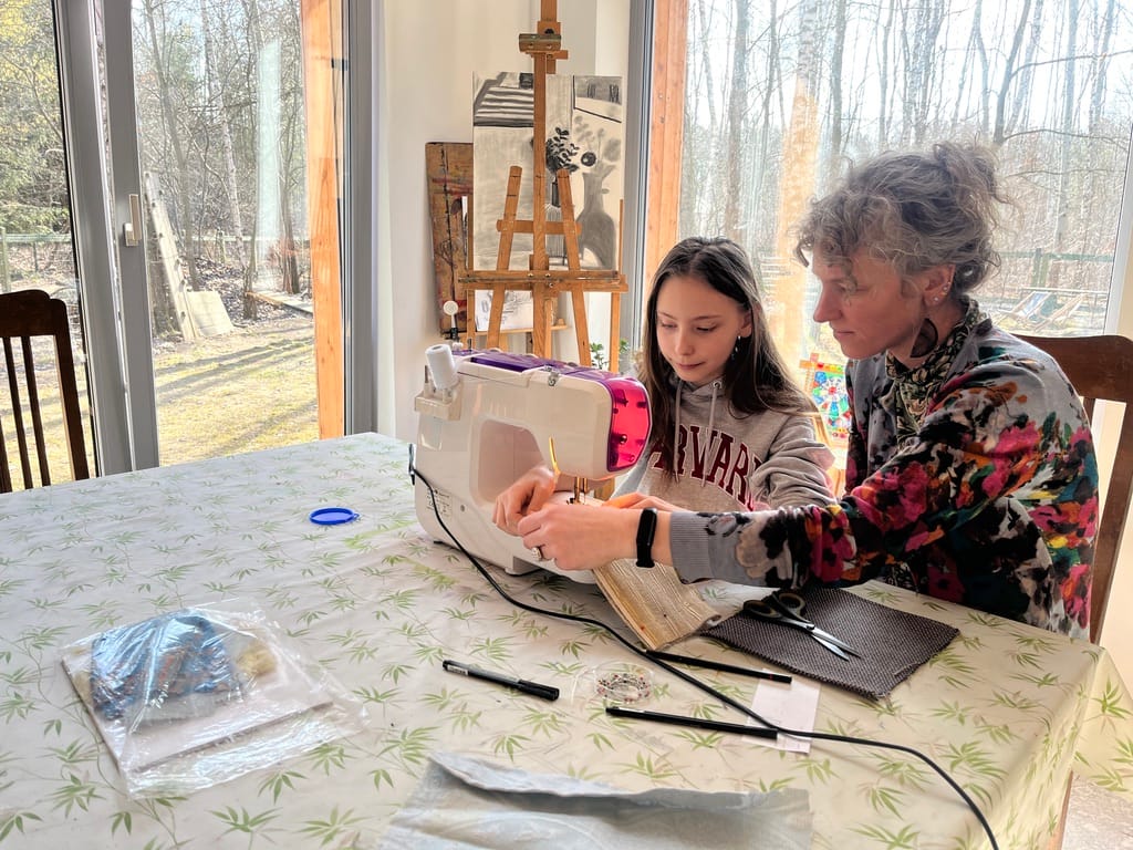 It was the same Tuesday as the one when the film crew and Iga were at my place. Except that was in the morning and I was at drawing class. But today there was no drawing. Since I told the teacher during the first class that I make clothes on a mannequin, today she prepared a machine sewing lesson for me. So that if I get a machine for my birthday or something like that, I'll know how to operate it. The teacher decided that we would sew a bag. First, she showed me fabric samples. She had two huge books with samples. I chose a white one with nude-colored lines. Then I pinned needles along the edges.