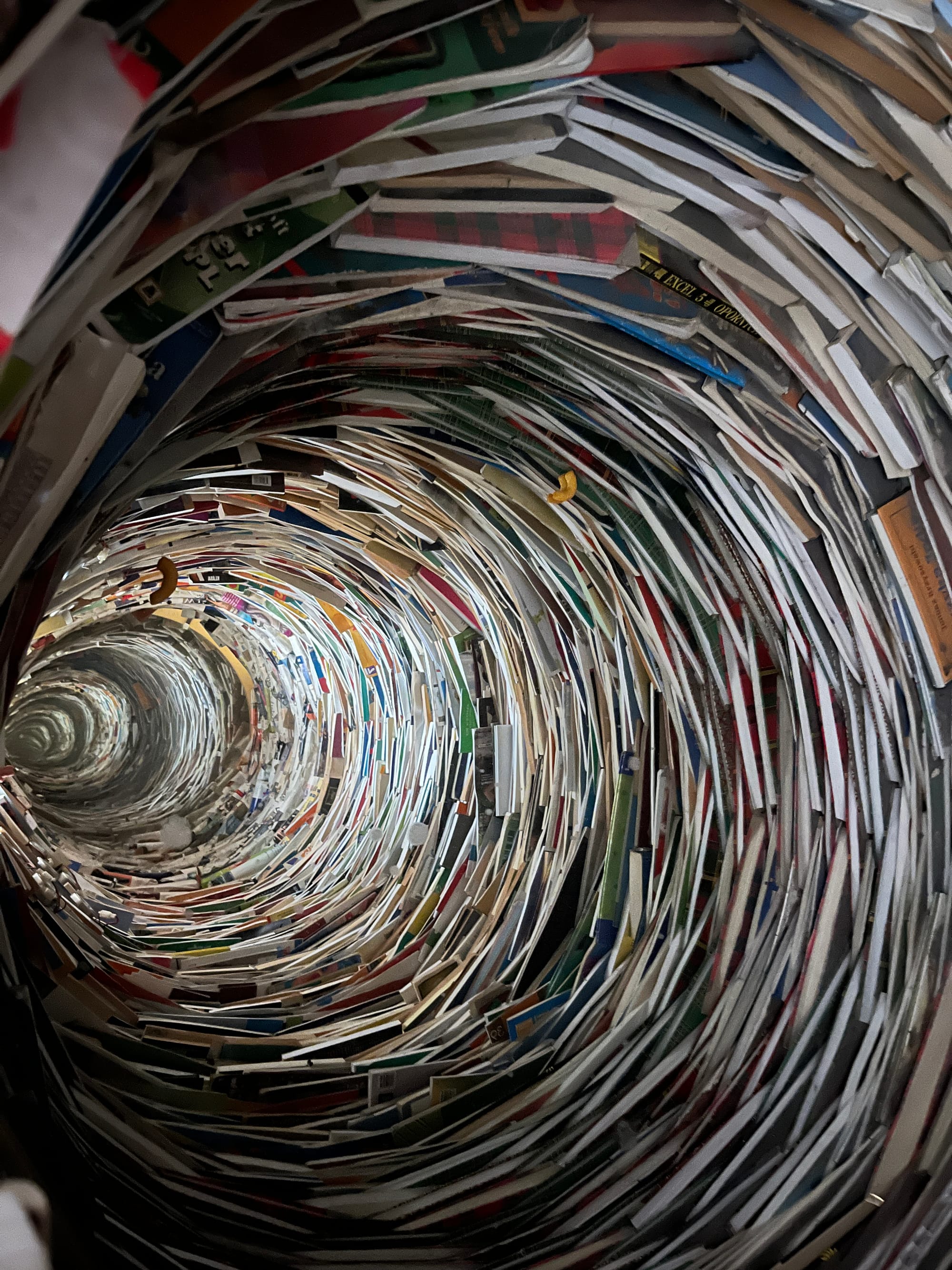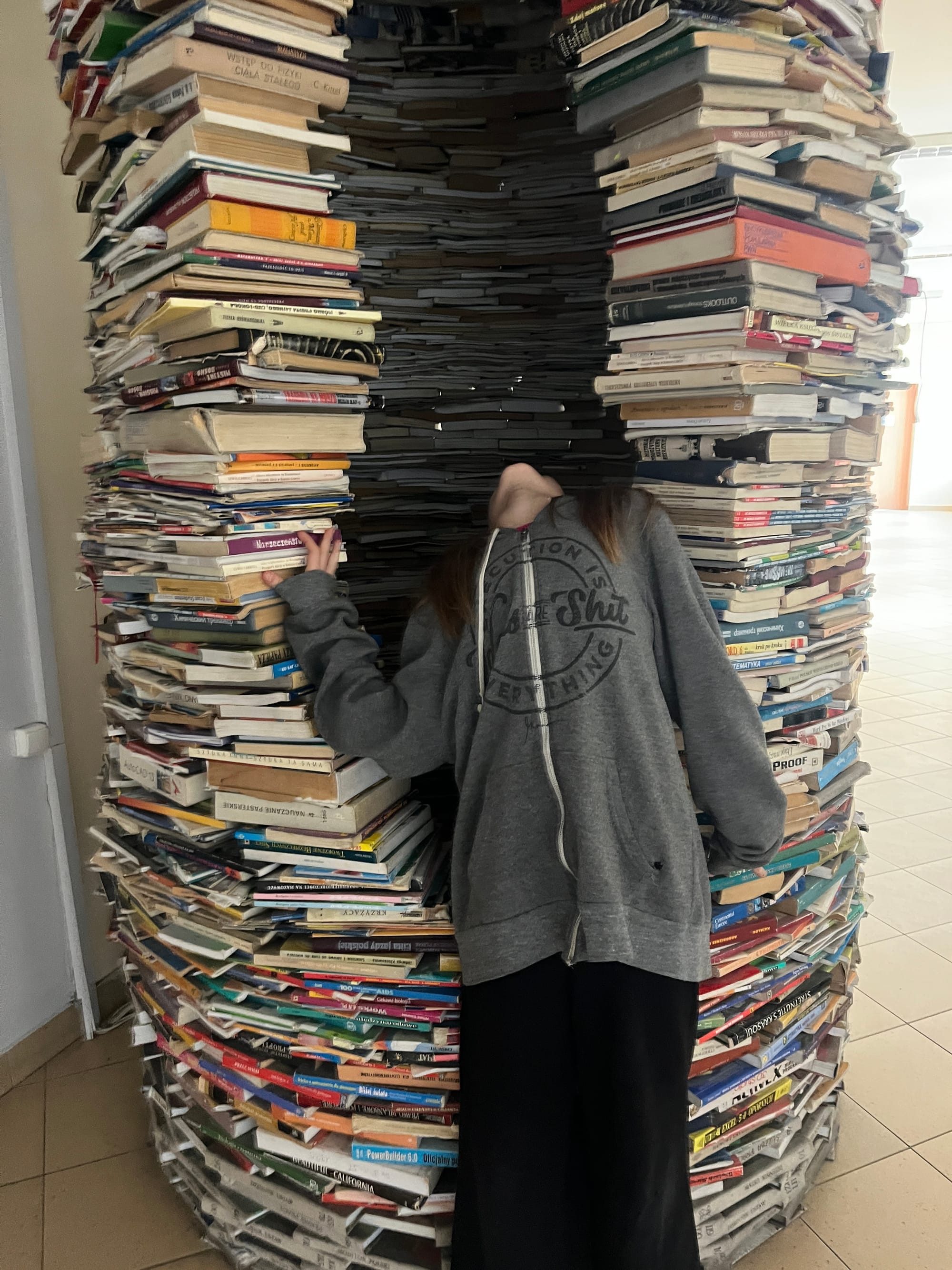The downside - you have to travel far to take exams. For me, for example, it's POINTLESS, because I usually pass in 15, 30 minutes. Basically, I spend more time in the car than on-site. Later, as I was walking with my mom to the canteen for some grub, I saw a humongous pile of books. But the pile wasn't a pile. It was a huge chimney! When I looked inside